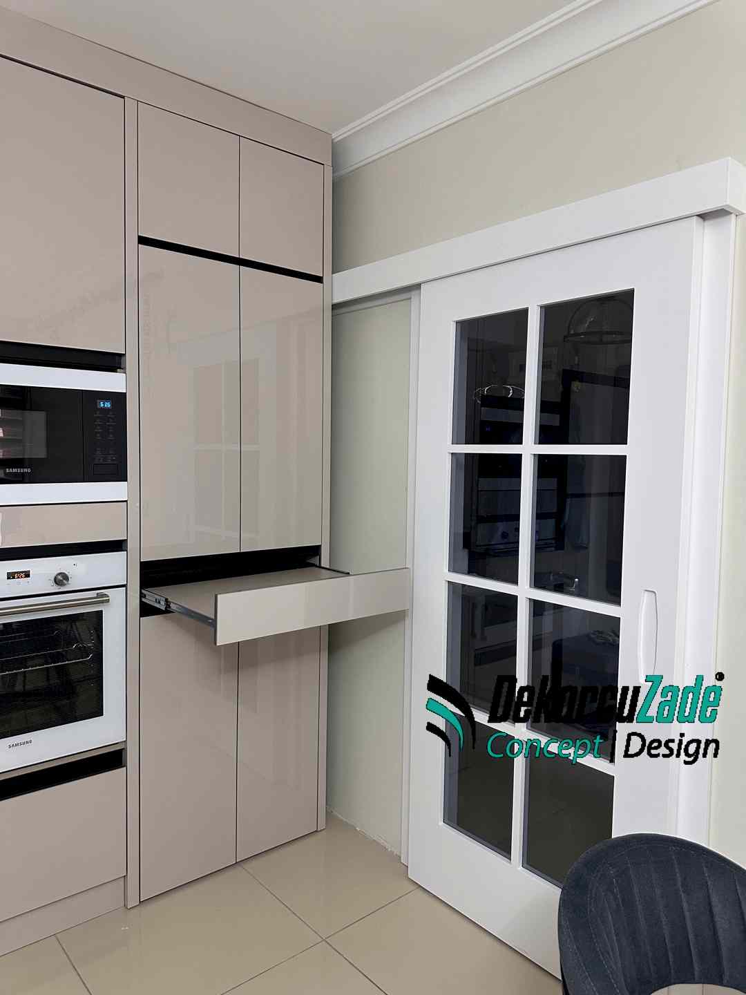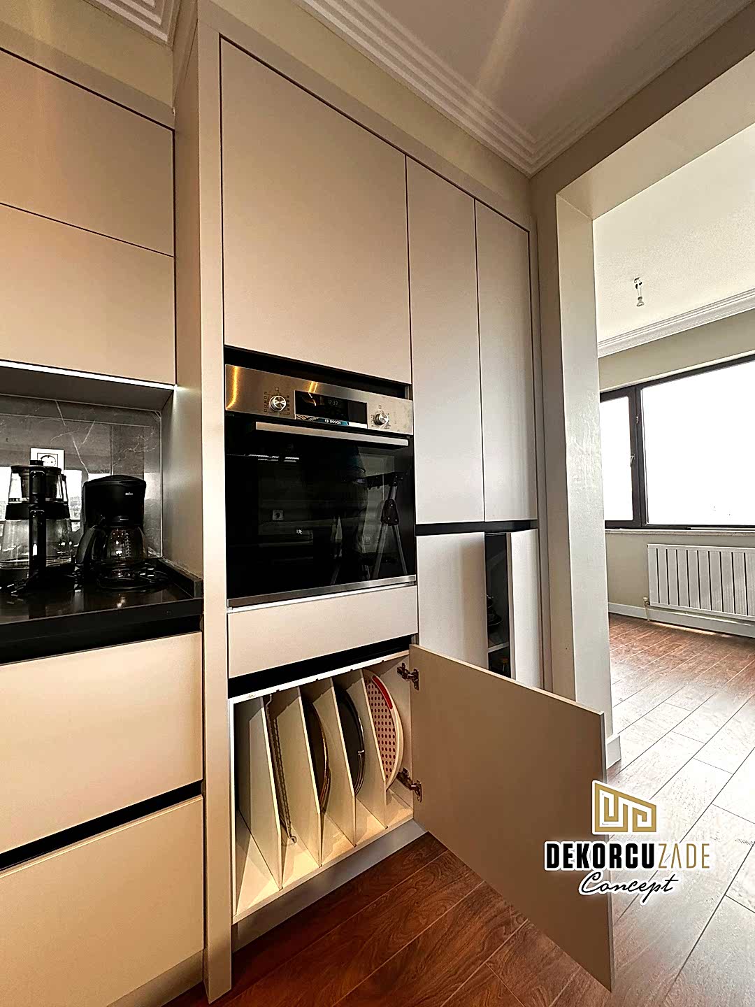 - Özel Tasarım Dolaplar: Küçük, dar veya sıra dışı formlara sahip mutfaklarda, özel tasarım dolaplar ile kusursuz kullanım kolaylığı elde edilebilir.