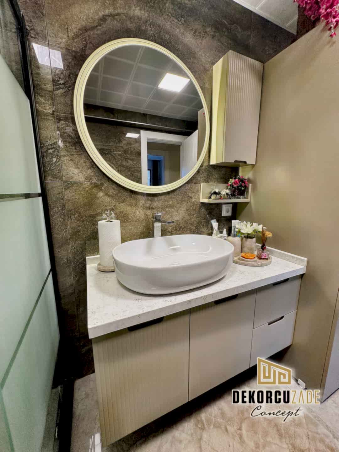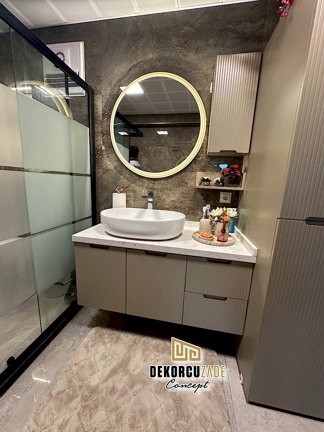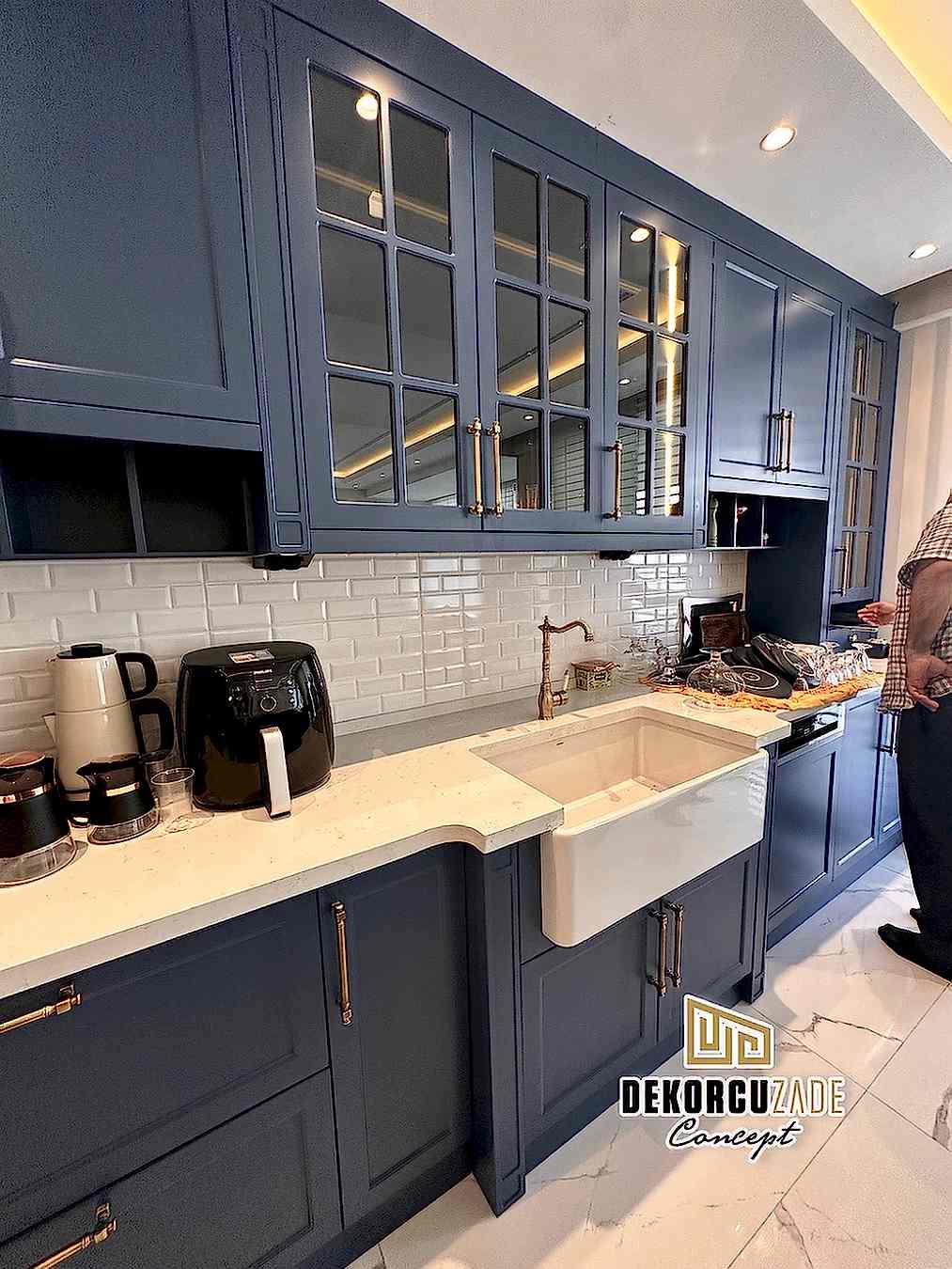 Yapmış olduğumuz komple ev villa mutfak banyo tadilatı için kullandığımız dolaplar, DekorcuZade Ankara dolap modelleri, kesinlikle fizik, statik, mukavemet ve matematik bilimini içerir. Mutfak imalatı yaparken kullandığımız mekanizmalar, kaldırabileceği yük düşünülerek özenle tercih edilmektedir. Üreticinin tavsiye ettiği limitler uygulanmaktadır. Ankara ve dışında yapmış olduğumuz komple ev villa mutfak banyo tadilatı mobilyalarımızda, dünyanın en iyi dolap ve en kaliteli mekanizması olan BLUM markalı mekanizmaları kullanıyoruz. Çoğu firmada ekstra olarak sunulan özellikler, DekorcuZade için başlangıç standartıdır. Dolap imalatı için kullandığımız tüm ham maddelerde, E1 normunda (anti-kanserojen) ham maddeleri tercih ediyoruz. Ankara’da imalatını yaptığımız tüm mutfak dolabı birleşim noktalarında yat tutkalı kullanıyoruz. Bu sayede tam sağlamlık sağlıyoruz. Mutfak üst dolaplarımızda, dolap asma aparatı kullanmıyor, DekorcuZade’nin geliştirdiği özel dolap asma detayı ile %100 düşmeme ve zamanla sarkma olmayacağına garanti veriyoruz. Yapmış olduğumuz komple ev villa mutfak banyo tadilatı işlerinde, boyalı (lake kapaklı) dolap modellerimiz, dünyanın tartışılmaz en iyi boya markası olan SAYERLACK ile boyanmaktadır. Ürünlerimizi tek yüz değil, çift yüz boyalı olarak standart olarak Ankara’da kendi mobilya atölyemizde görüyoruz. Mat lake kapaklarımız yedi kat, parlak lake kapaklarımızı on üç kat boya katmanı olacak şekilde görüyoruz. SAYERLACK ürünlerini tavsiye ediyoruz. Üst dolap modül çizgilerinin içerisinde zamanla oluşan yağlanmanın önüne geçme adına, mutfak üst dolaplarımızın alt kısmını kapak ile aynı malzemeden kaplıyoruz. DekorcuZade’ye özel detaylar ile tezgahın aydınlatılmasını sağlıyoruz.