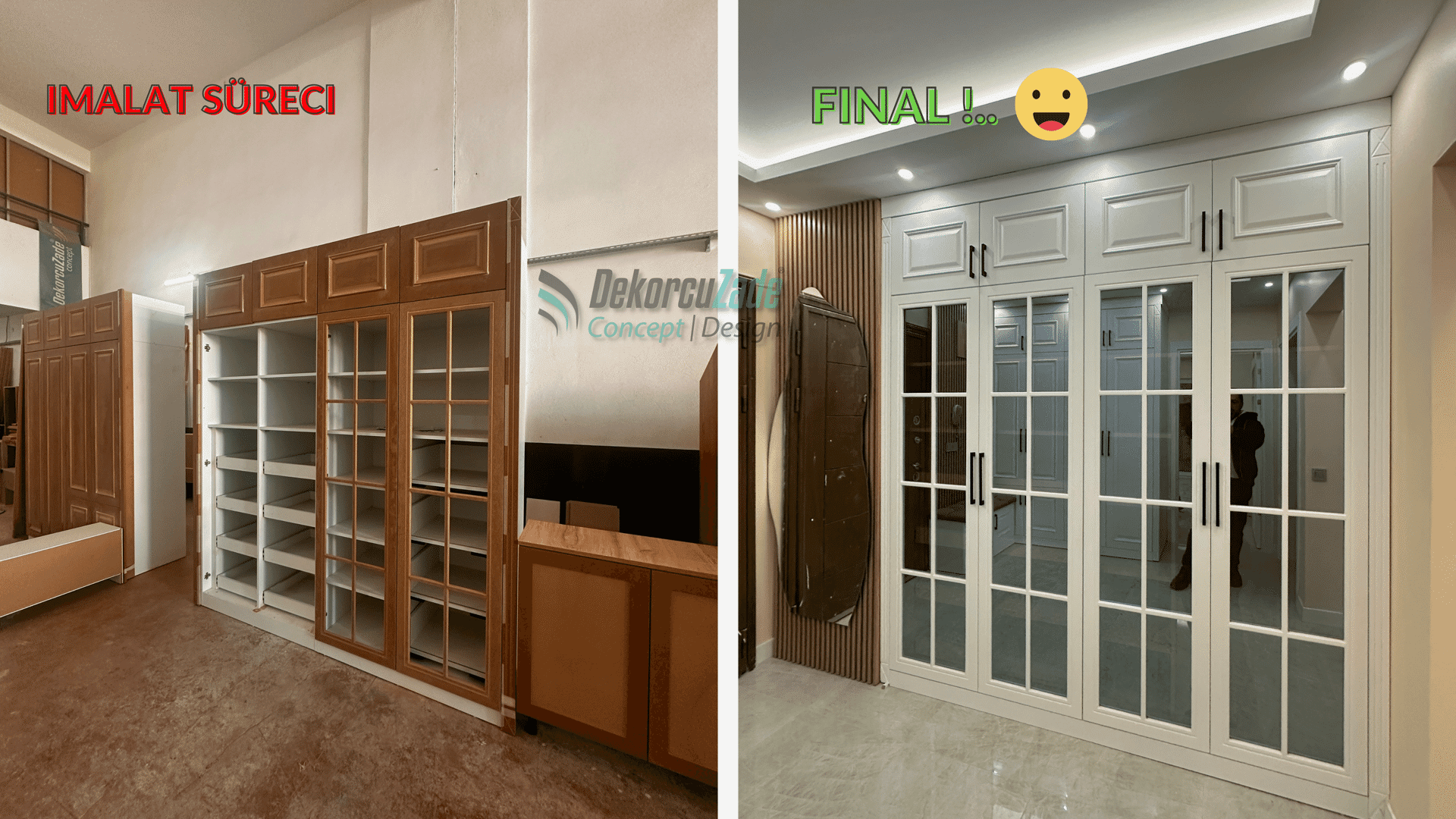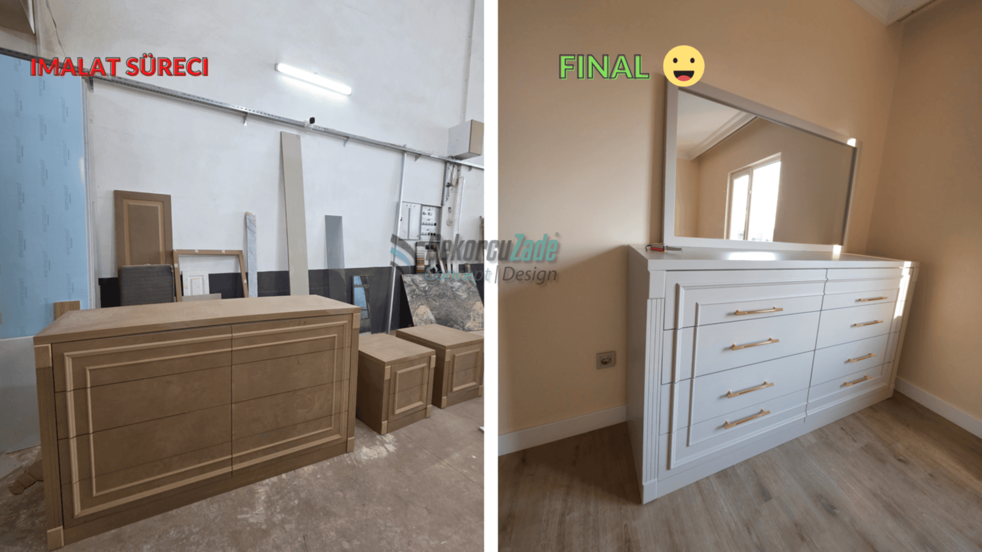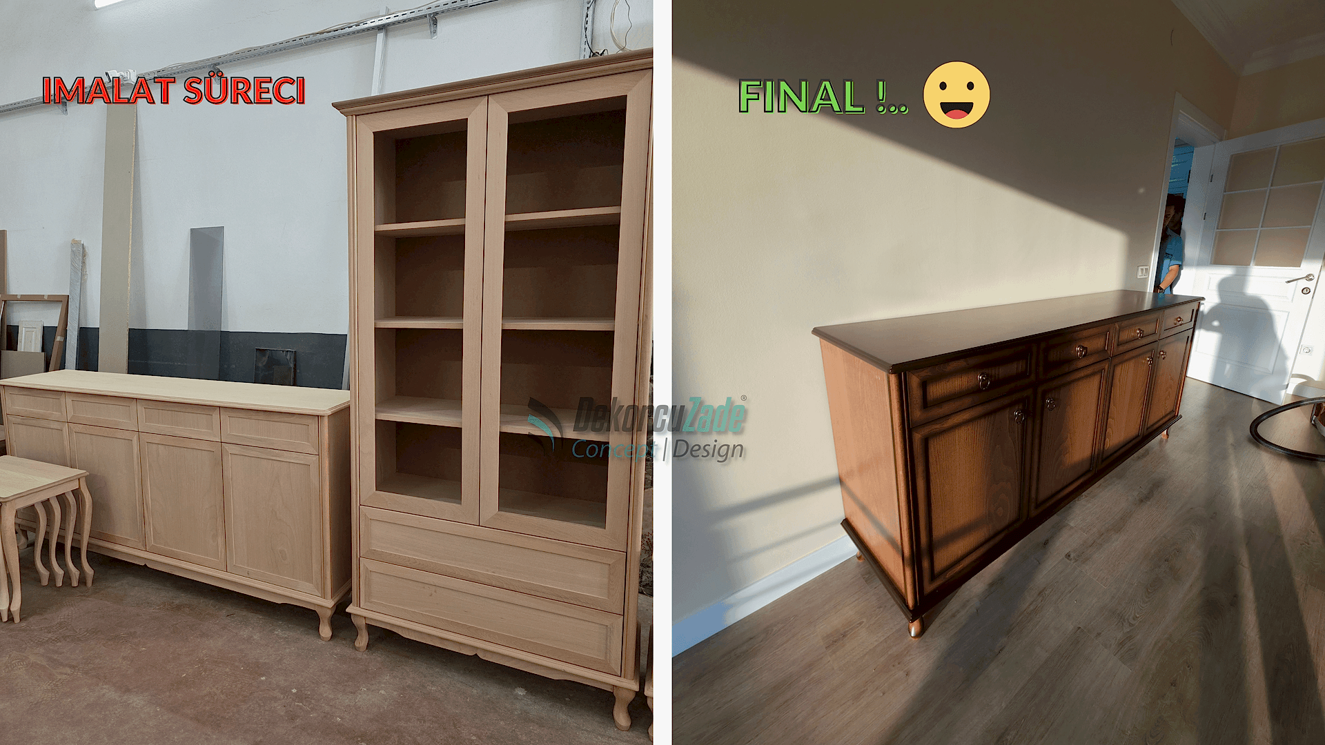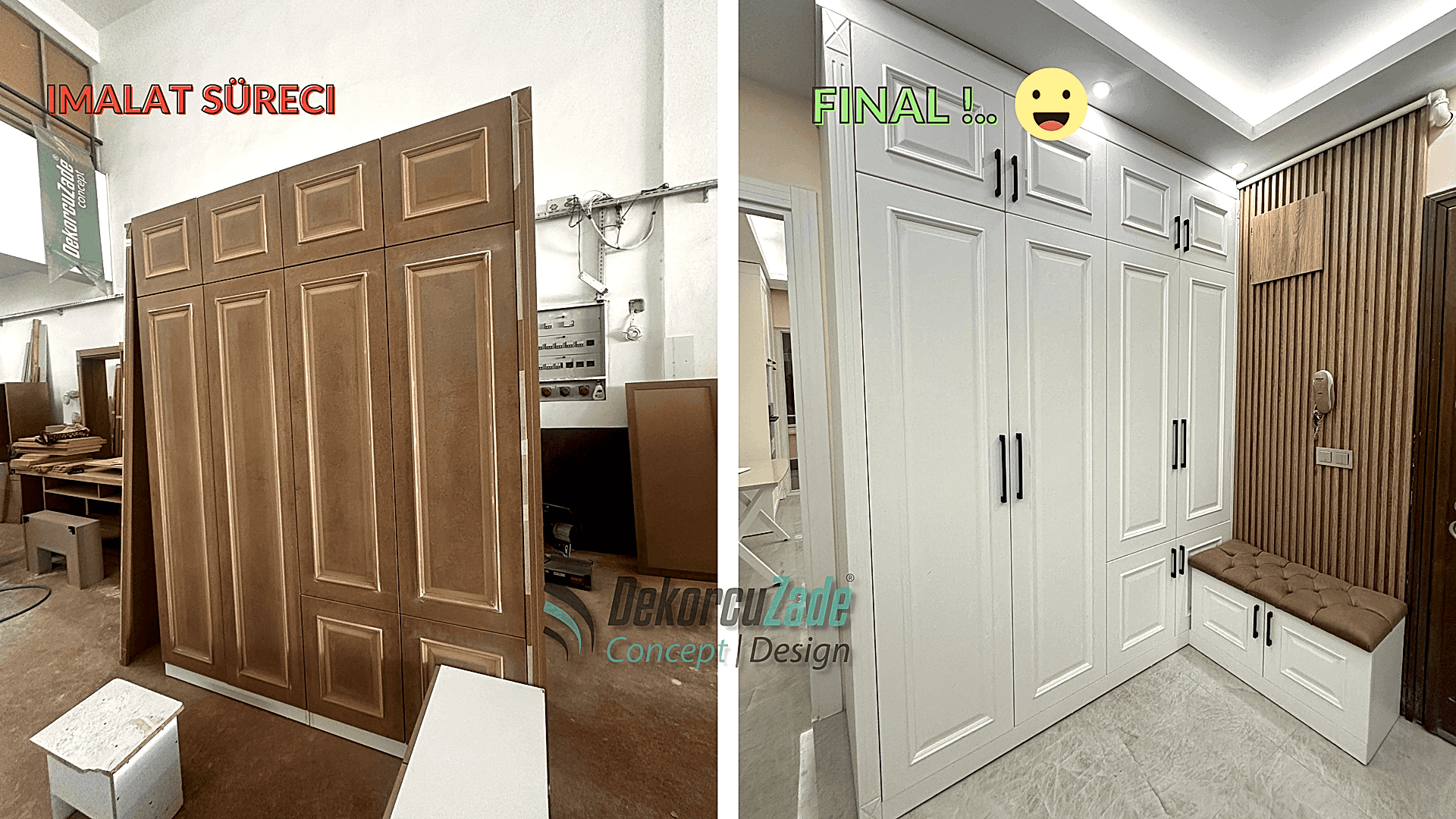 Kullanılan tüm mobilyalar, Dekorcuzade’nin kendi üretim tesislerinde, müşterimizin ölçülerine ve zevkine göre özel olarak üretildi.