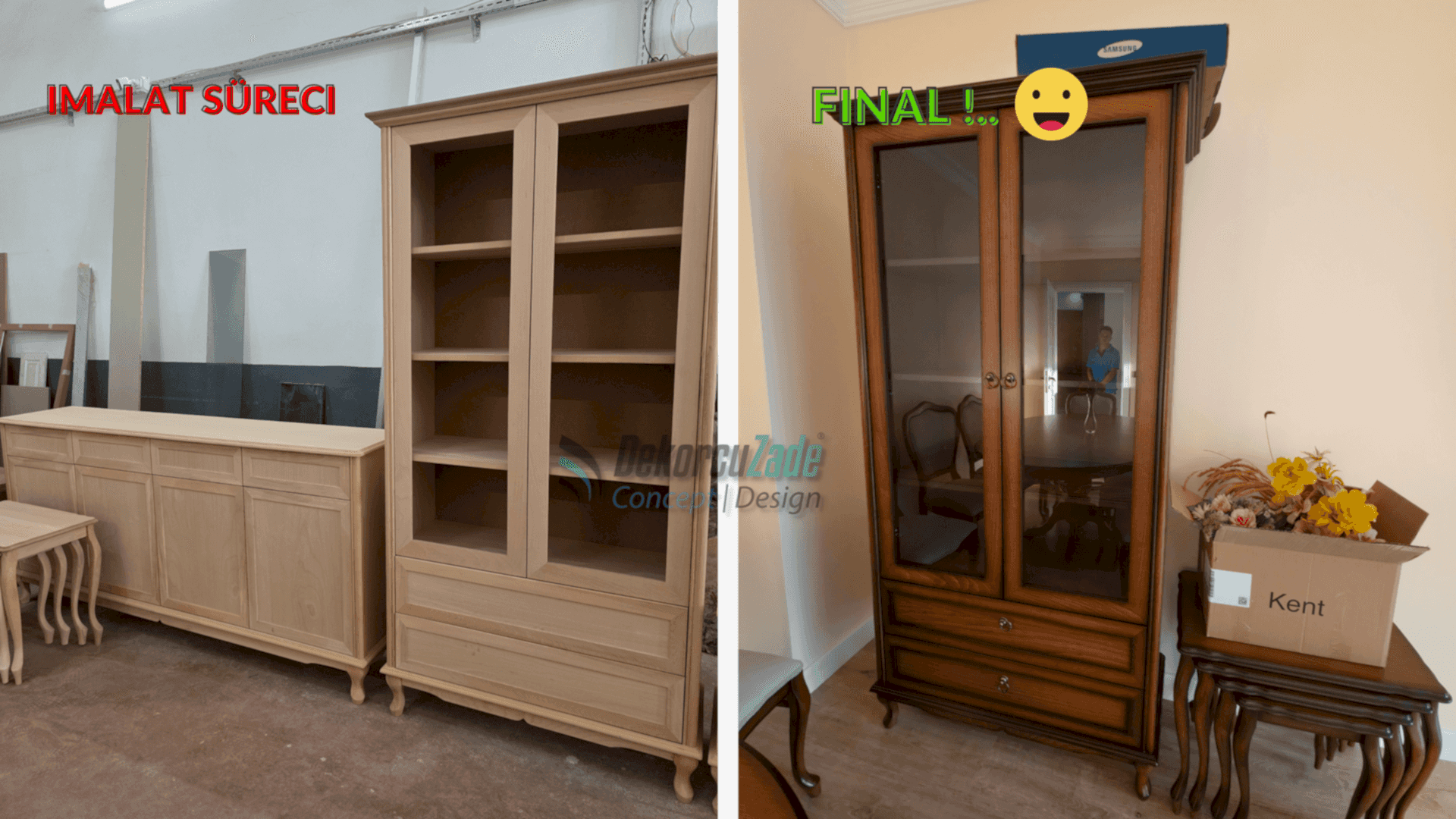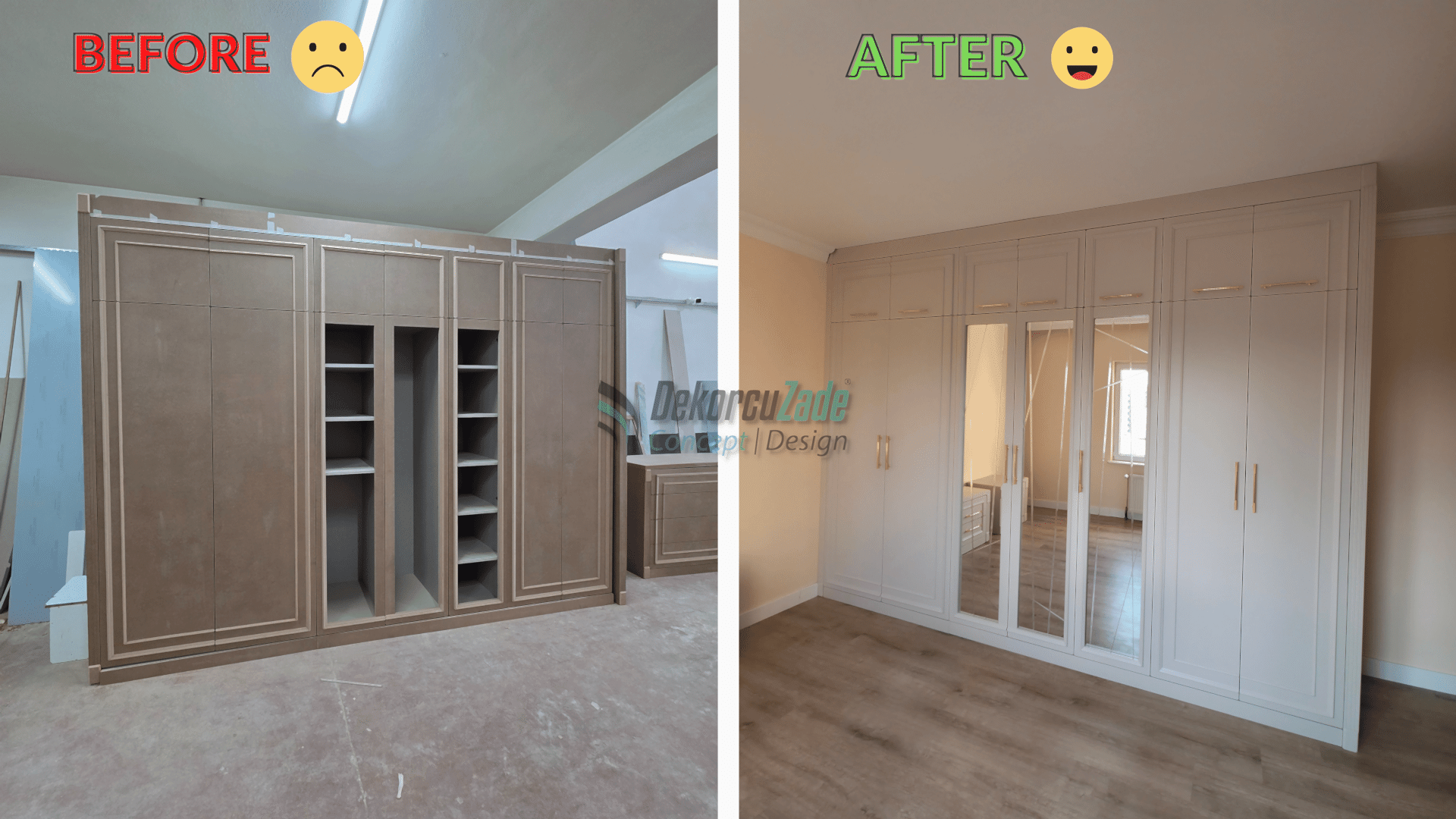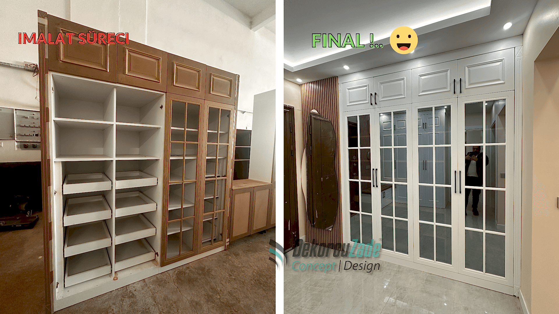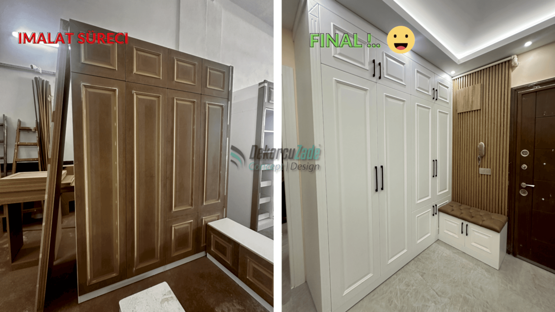 Kullanılan tüm mobilyalar, Dekorcuzade’nin kendi üretim tesislerinde, müşterimizin ölçülerine ve zevkine göre özel olarak üretildi.